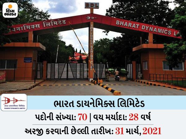 ભારત ડાયનેમિક્સ લિમિટેડે અલગ અલગ ટ્રેડમાં પ્રોજેક્ટ મેનેજરના 70 પદો પર ભરતી માટે અરજી મગાવી છે. ઉમેદવાર તેના માટે ઓનલાઈન અરજી કરી શકે છે. ઉમેદવાર 31 માર્ચ, 2021 સુધી અરજી કરી શકે છે.